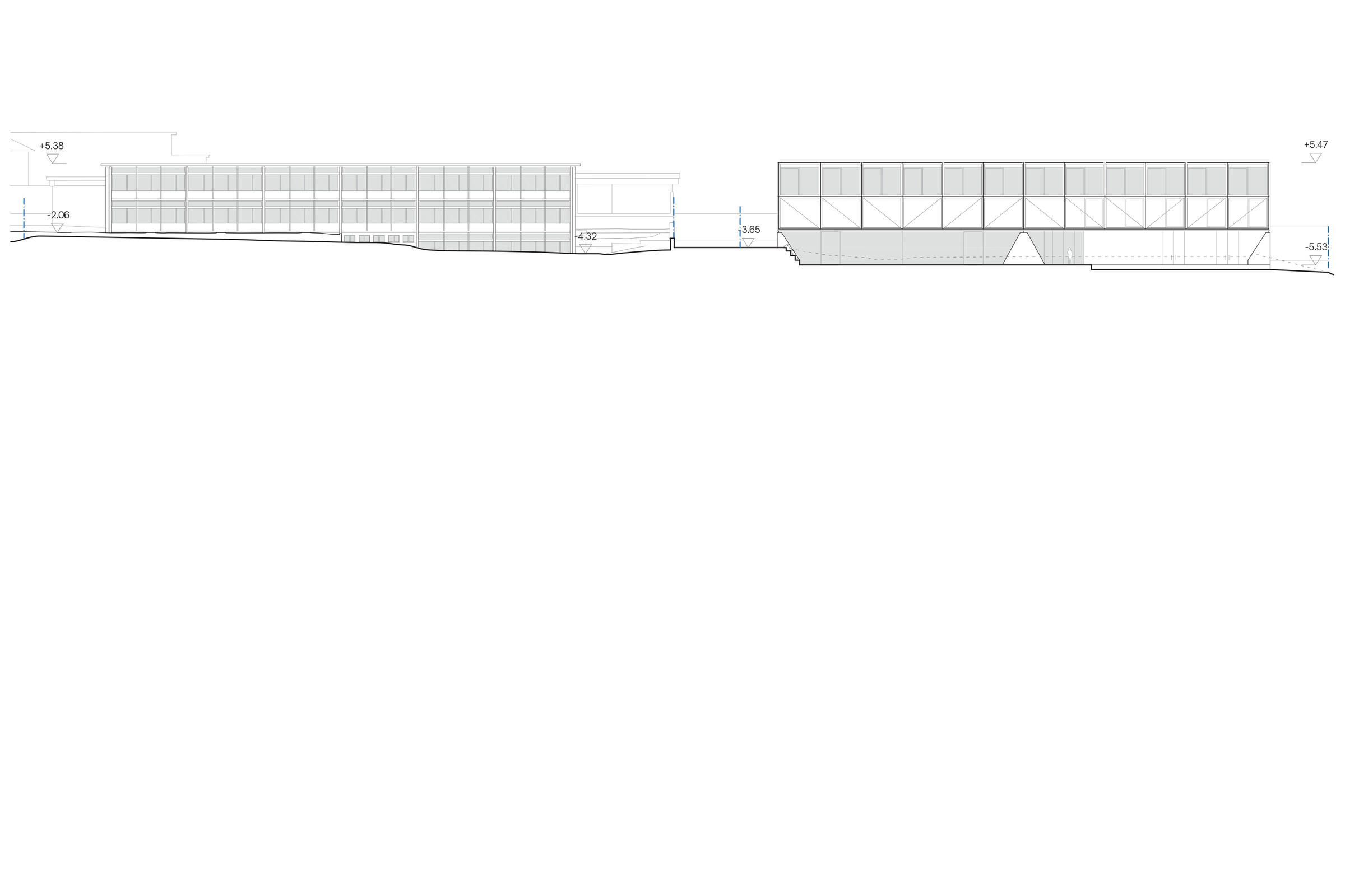 The existing elementary school building forms the track and direction of the new extension. The need to connect the two schools generates a 'backbone' through a linking subway that extends the entire length of the upstream area. The transition between the existing school and the new one is given by an uninterrupted pathway, providing safety and fluidity of movement for pupils and teachers.