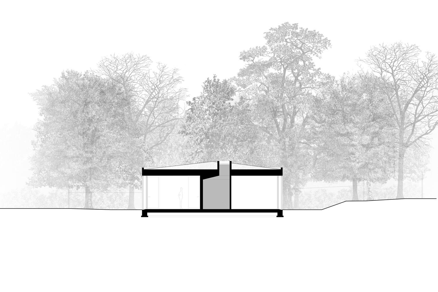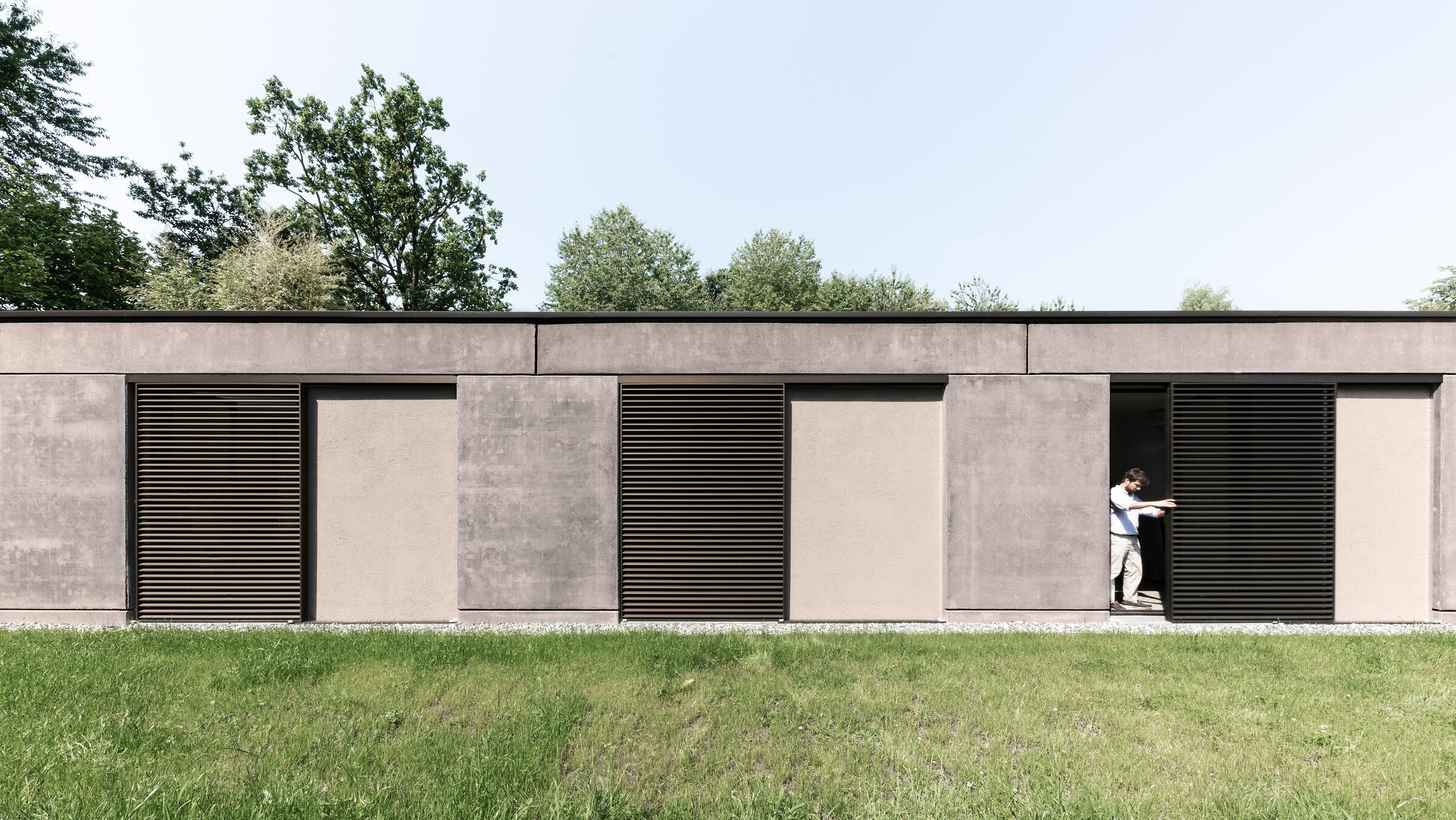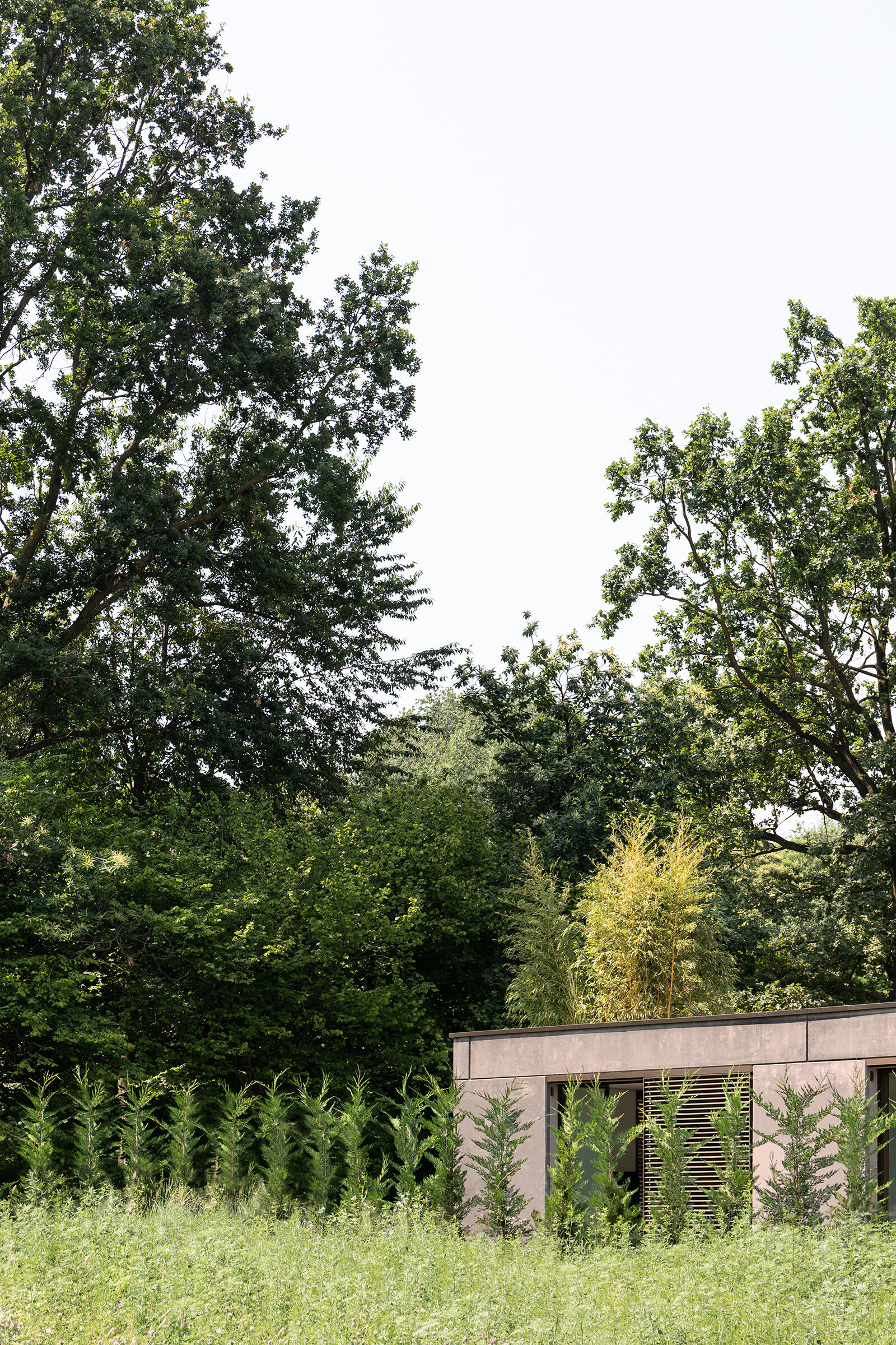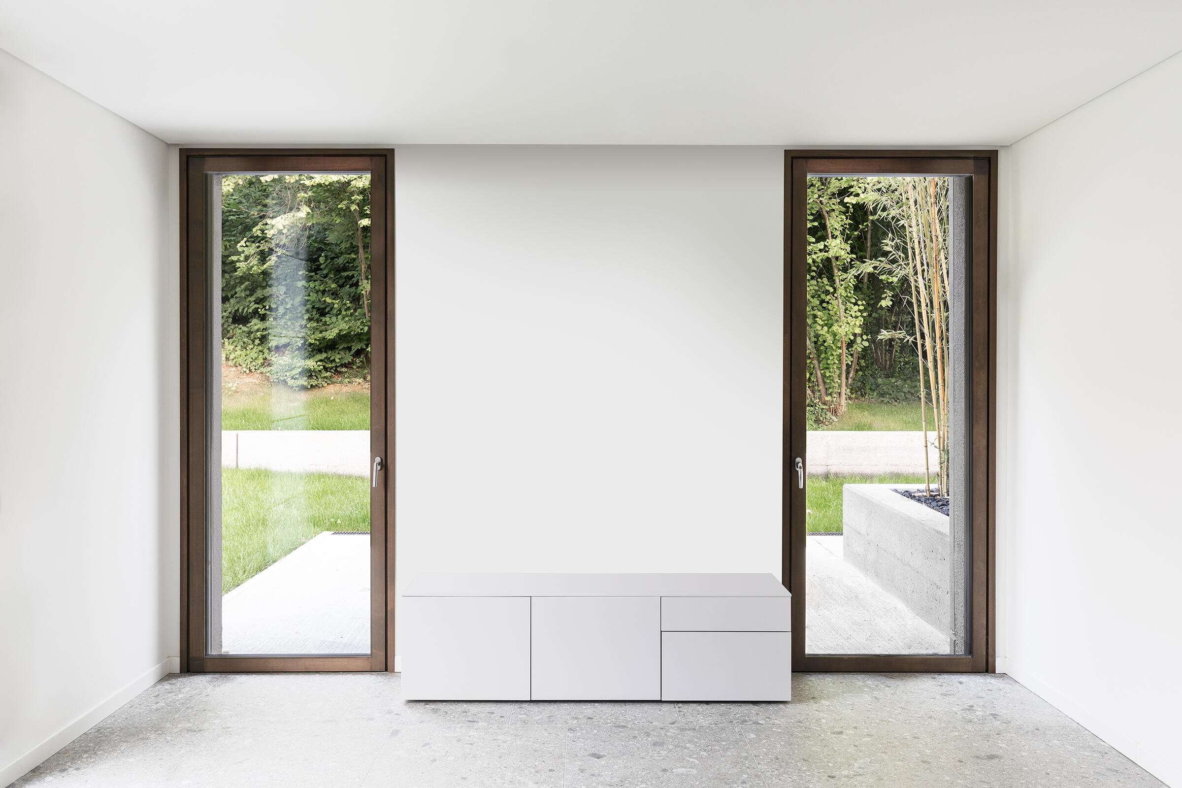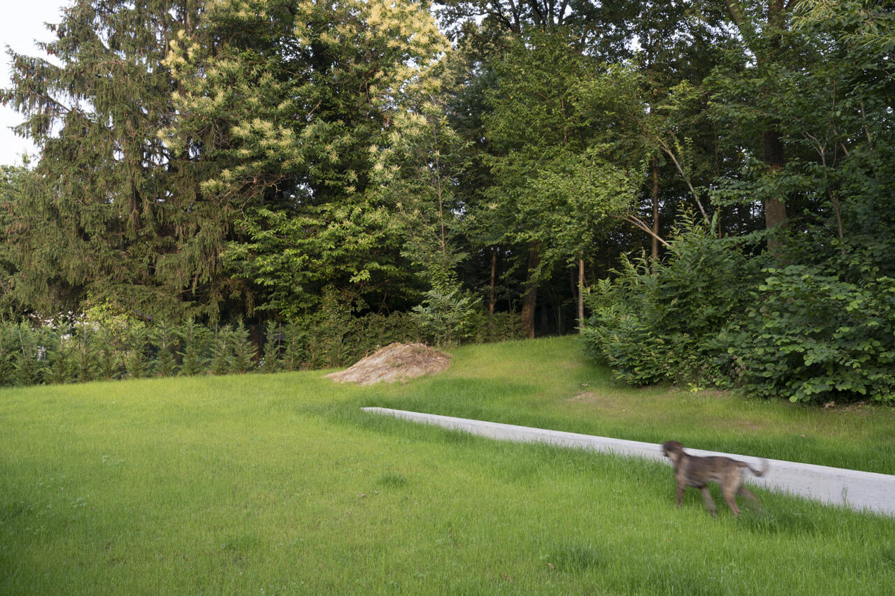 the intervention consists of a single-family house on one level. a rectangular shaped plan develops regular fronts punctuated by full and empty spaces through openings alternating with structural blind walls and sliding panels. a central service “spine” separates the sleeping area from the living area, which is organized as a succession of spaces overlooking the natural landscape of the moraine hill. the outdoor is s an extension of the house: on one side the entrance from the road is defined by a raised podium, on the other a more intimate space takes place. it is a strong geometric gesture that emphasizes the contrast between artificial intervention and natural landscape.