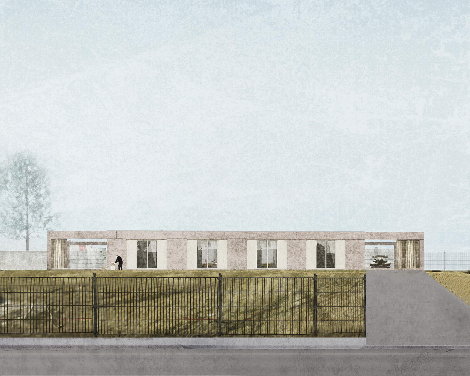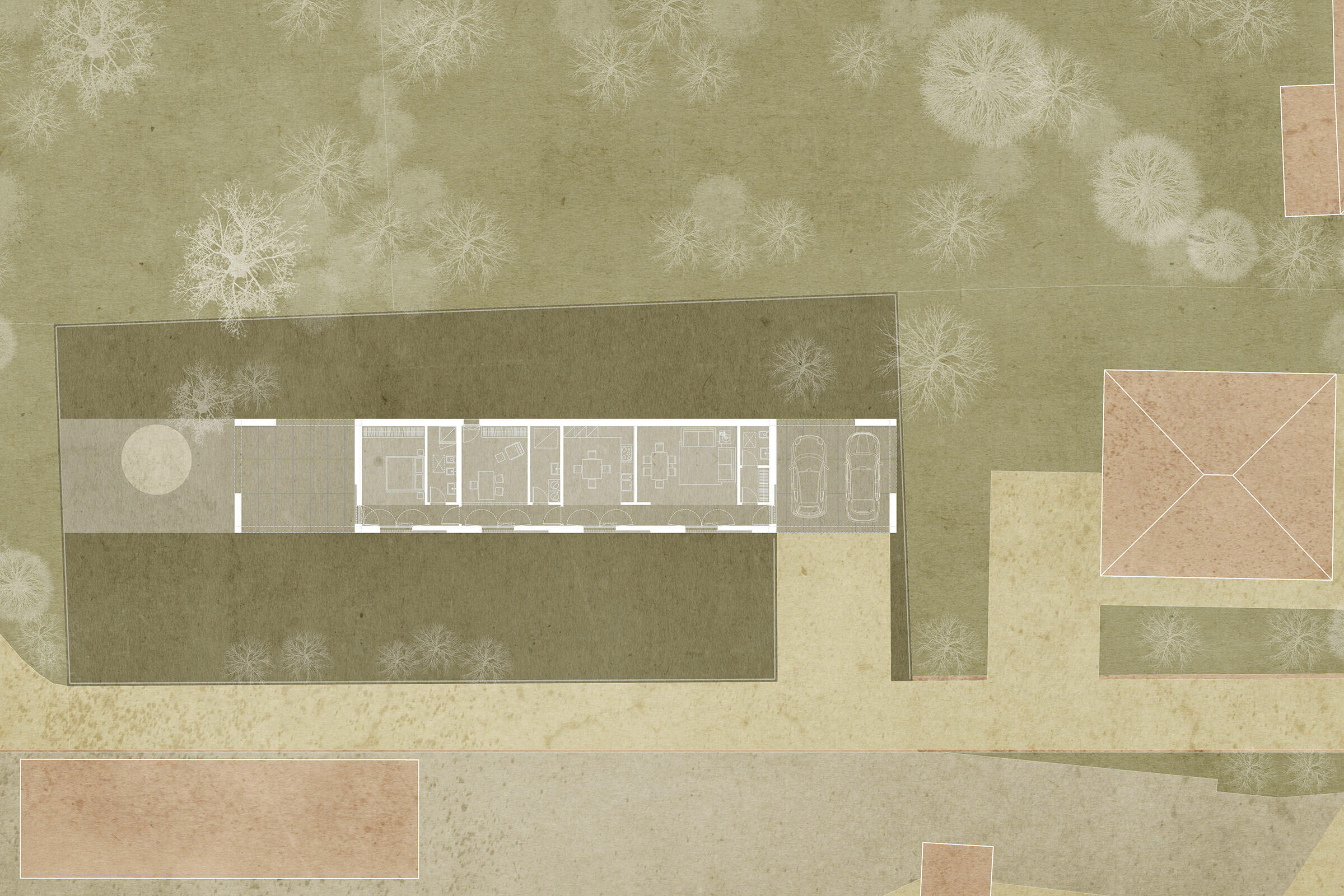 the building is an elongated rectangle mainly open southward through large windows interposed with concrete walls and sliding pannels. the full and empty rhythm of the facade is crowned by a lintel. two patios define the heads of the building and they are respectively the lobby of the house and the courtyard of the master bedroom. the two patios are connected by a distribution space inside the house that connects all indoor environments and creates an enfilade throughout the building. it is a trilite construction inspired by stonehenge’s primordial architectures and seeks in prefabrication a classical and tectonic expression.