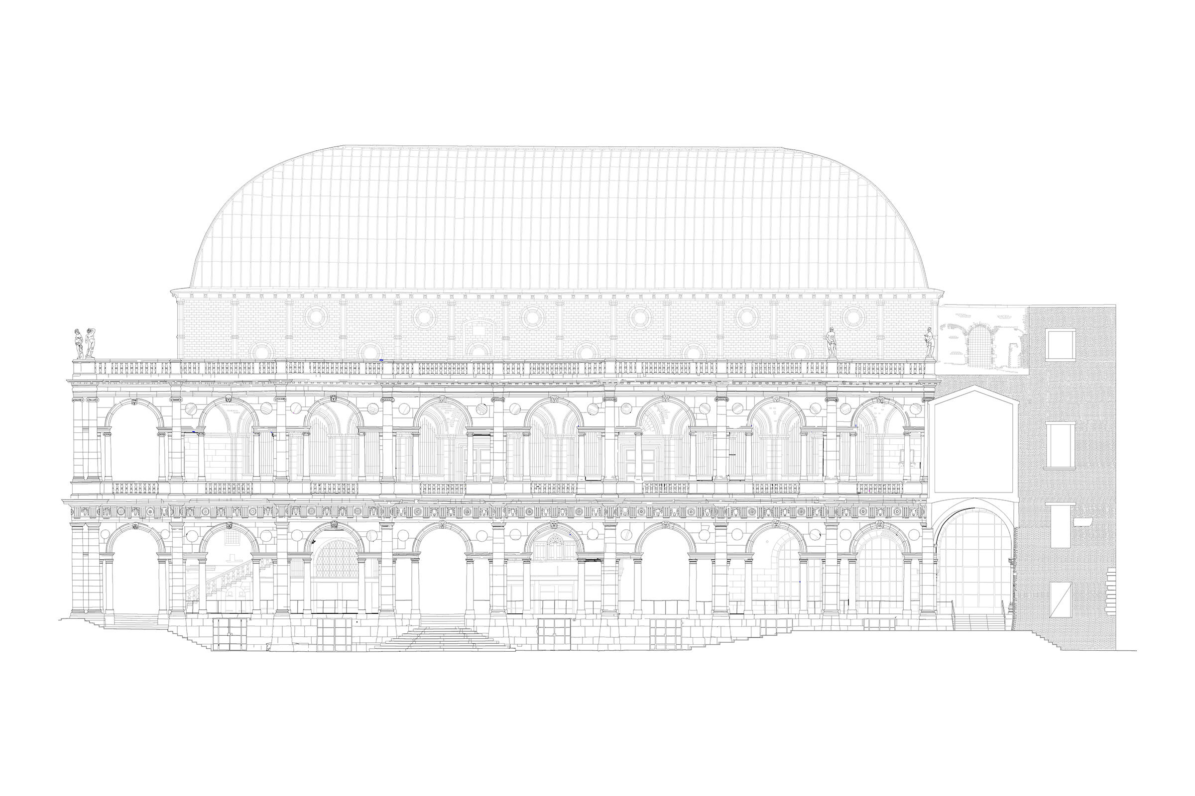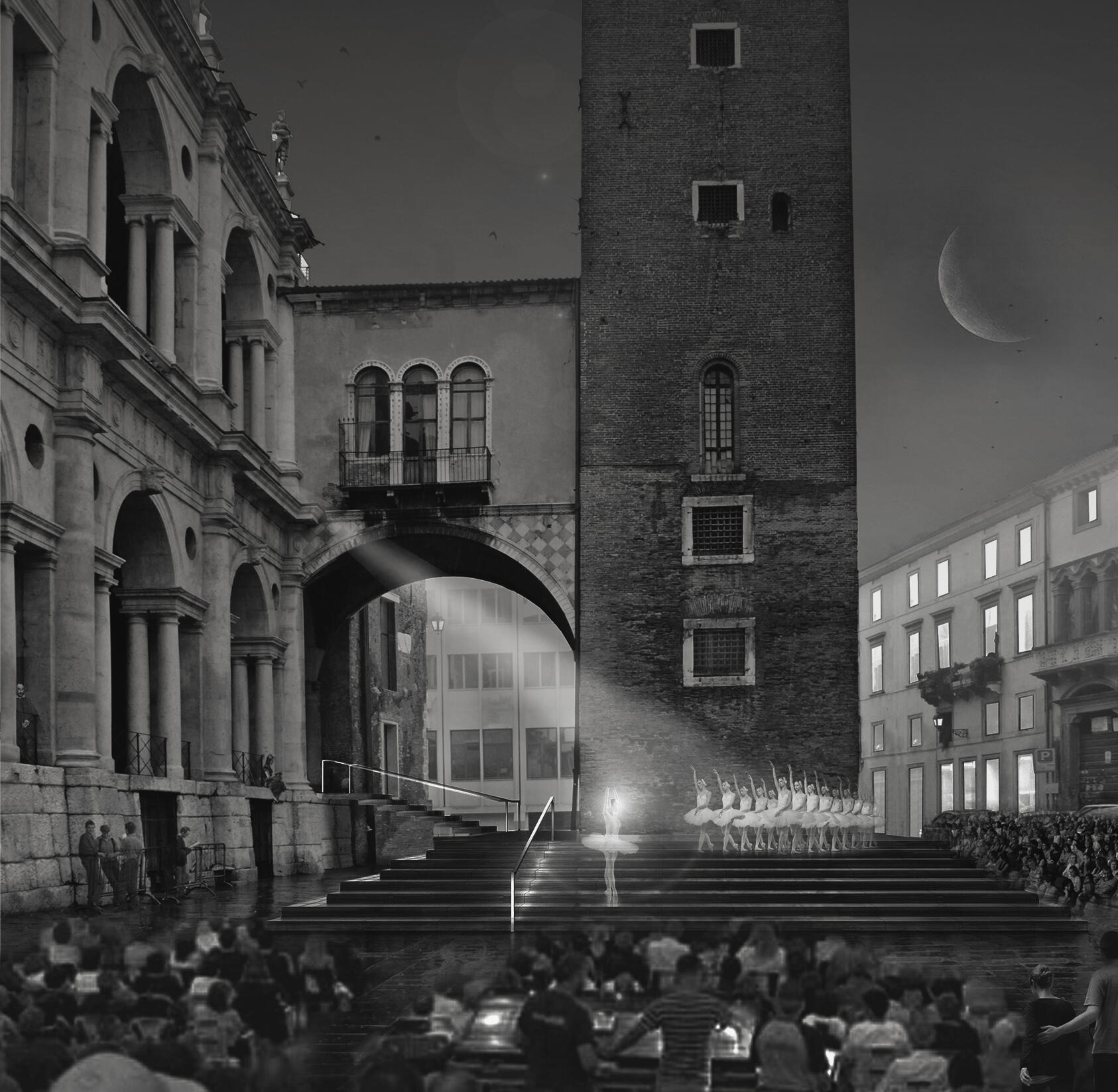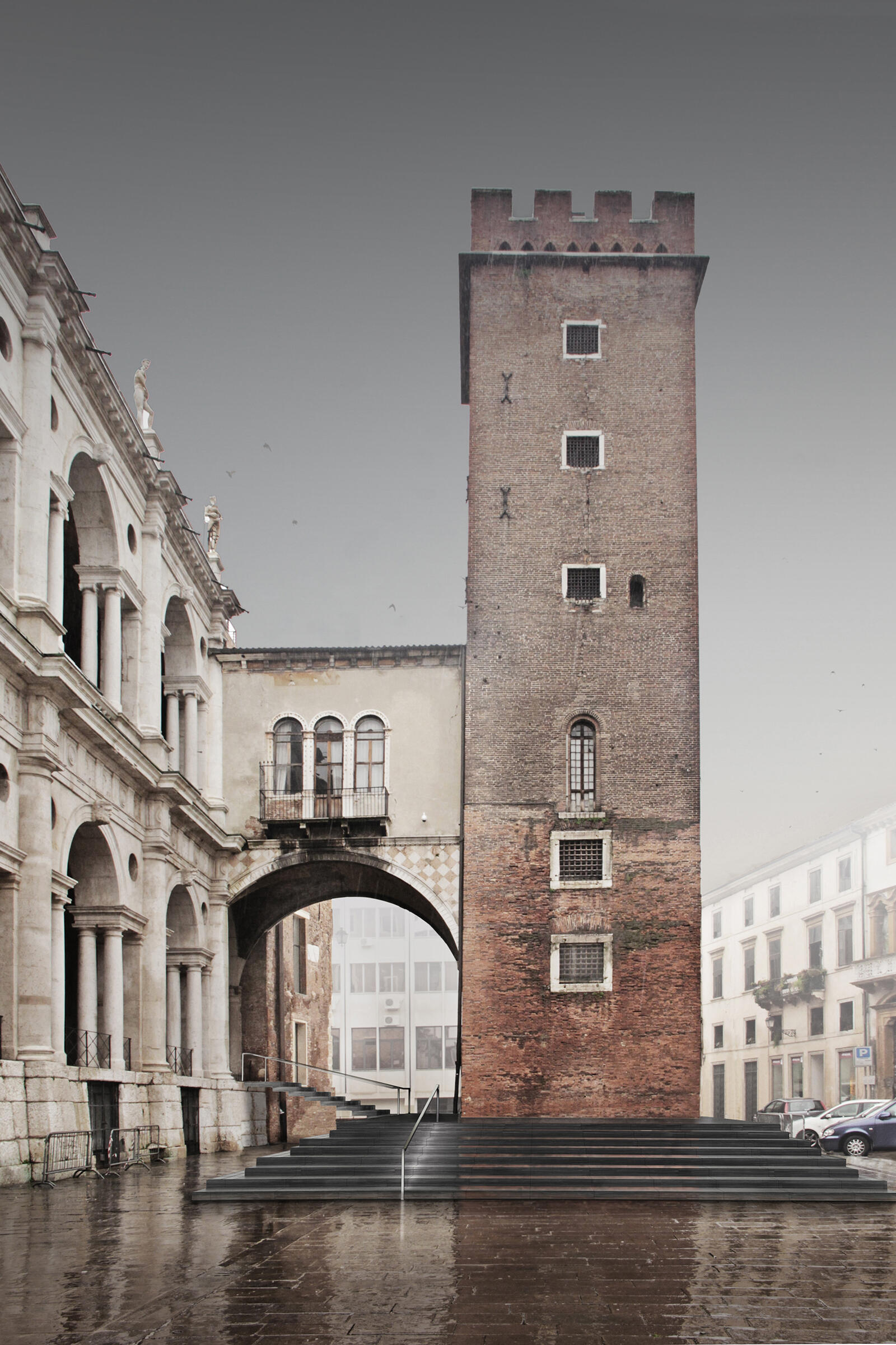 the proposal arises from the will to relate the elements in the square. the project looks like a large base that embraces the tower and operates as a hinge between the different sections of the area. the podium allows to walk from one side to another, leaving free the flows between the possible activities located at the lower floor of the basilica and the opposite side. the new intervention is supposed to be a possible entrance to basilica palladiana, or it can be a stage for concerts and performances, where the tower acts as a background. its simplicity helps and acts as a support to the spectacularization of the context and the possibilities of use.