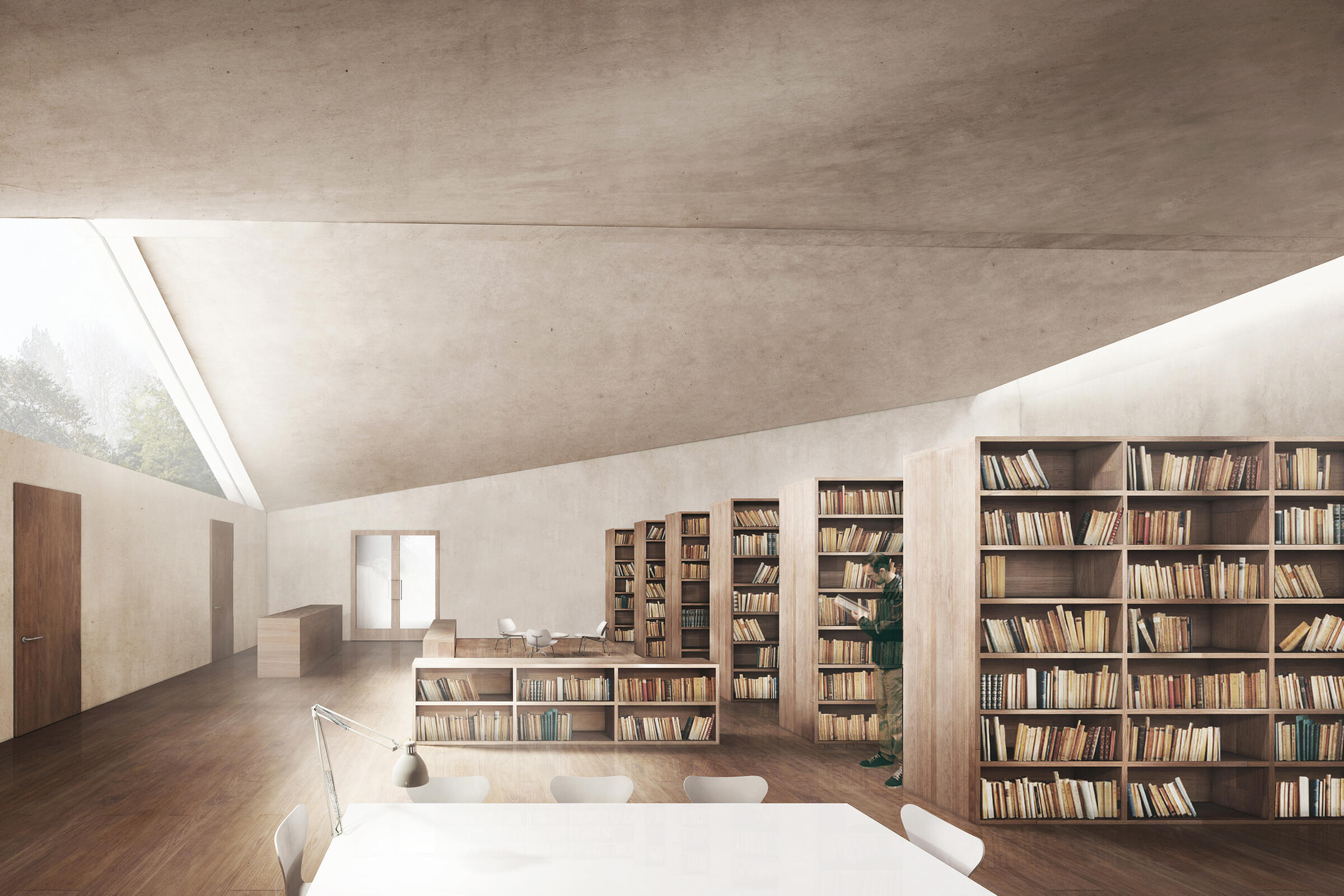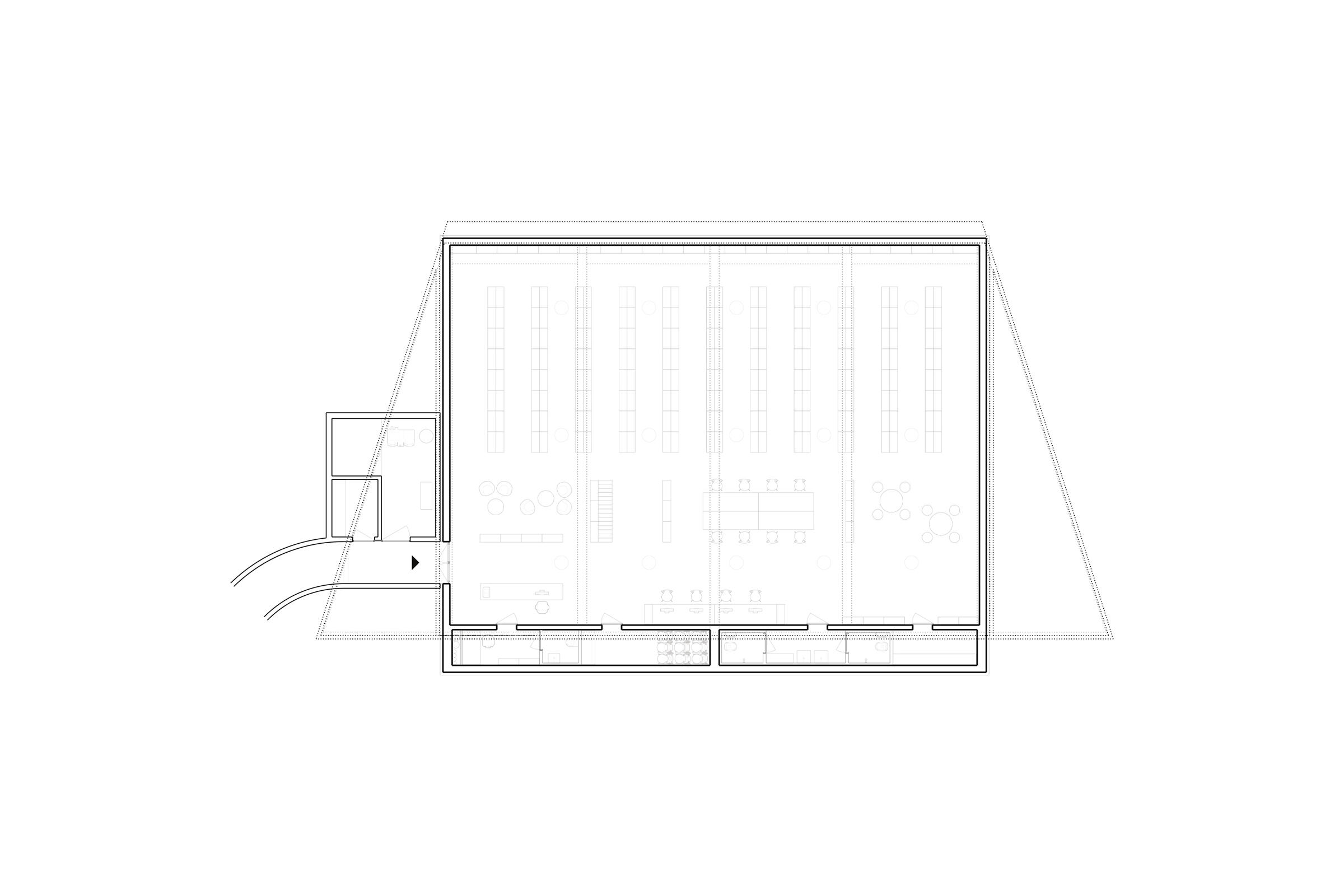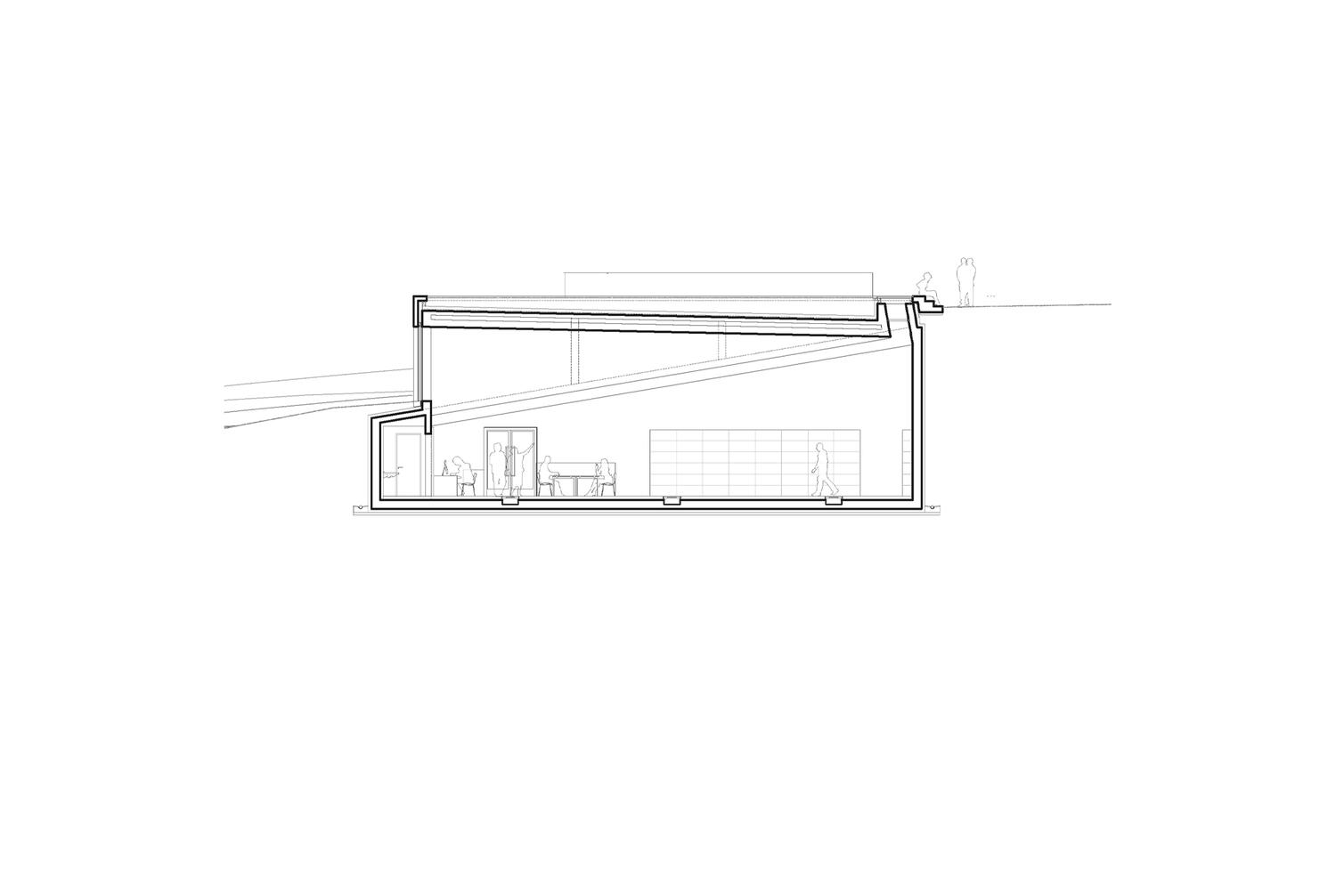 the building is inserted in the slope of the ground and it is characterized and identifiable by a single prospect. a sloping path leads to the entrance, preparing the users for the experience of an unexpectedly buried and bright space. the structural concept is reduced to three tilted pillars placed in support of the wall against the ground. the facade concretizes in a concrete beam-wall made up of five triangles whose vertices seem to be stuck in the ground, in order to define the anchorage of the project to the site. the building is deliberately introverted and does not aspire to establish a direct relationship with the views of the landscape but rather seeks light solutions ideal for the function of the building.