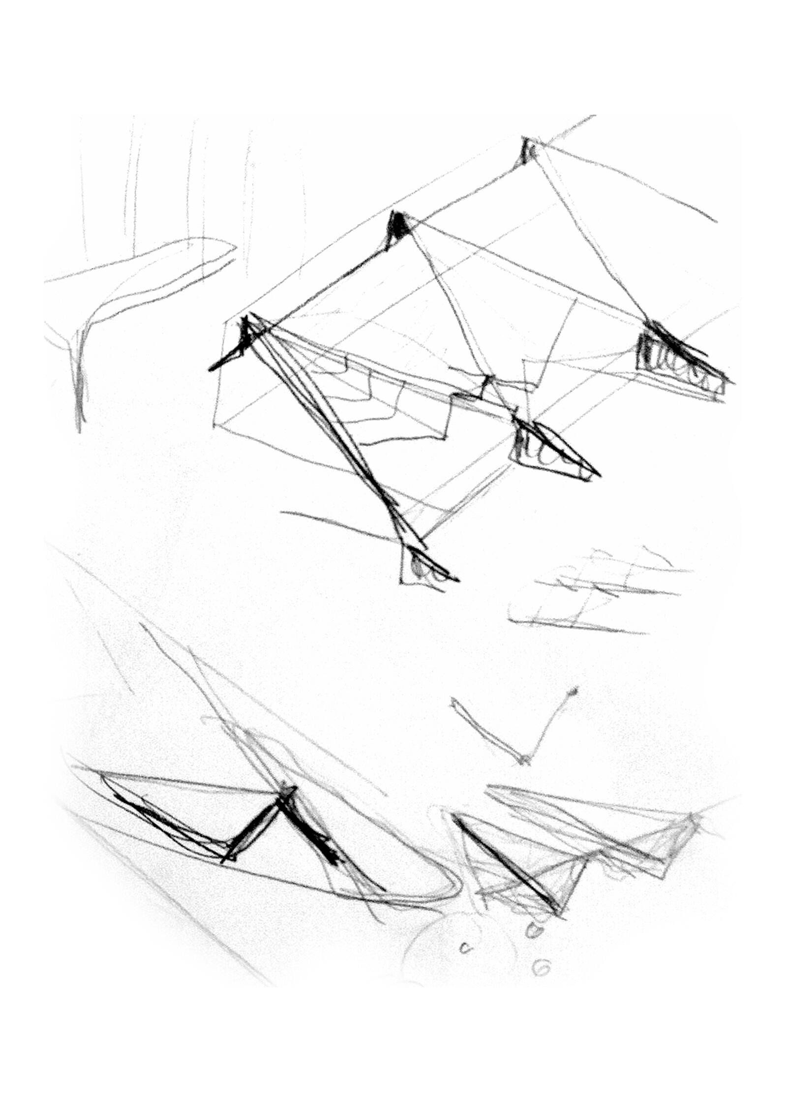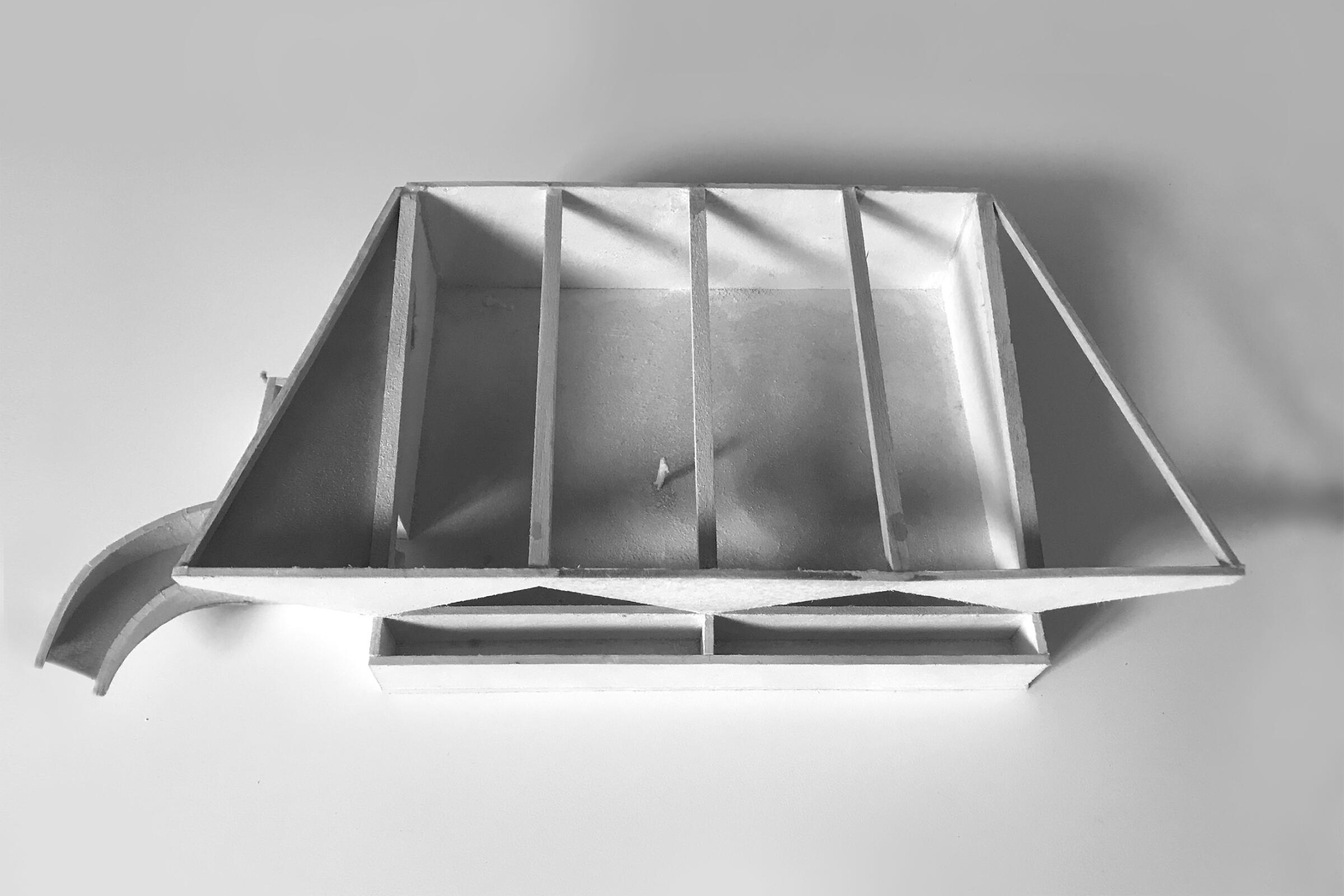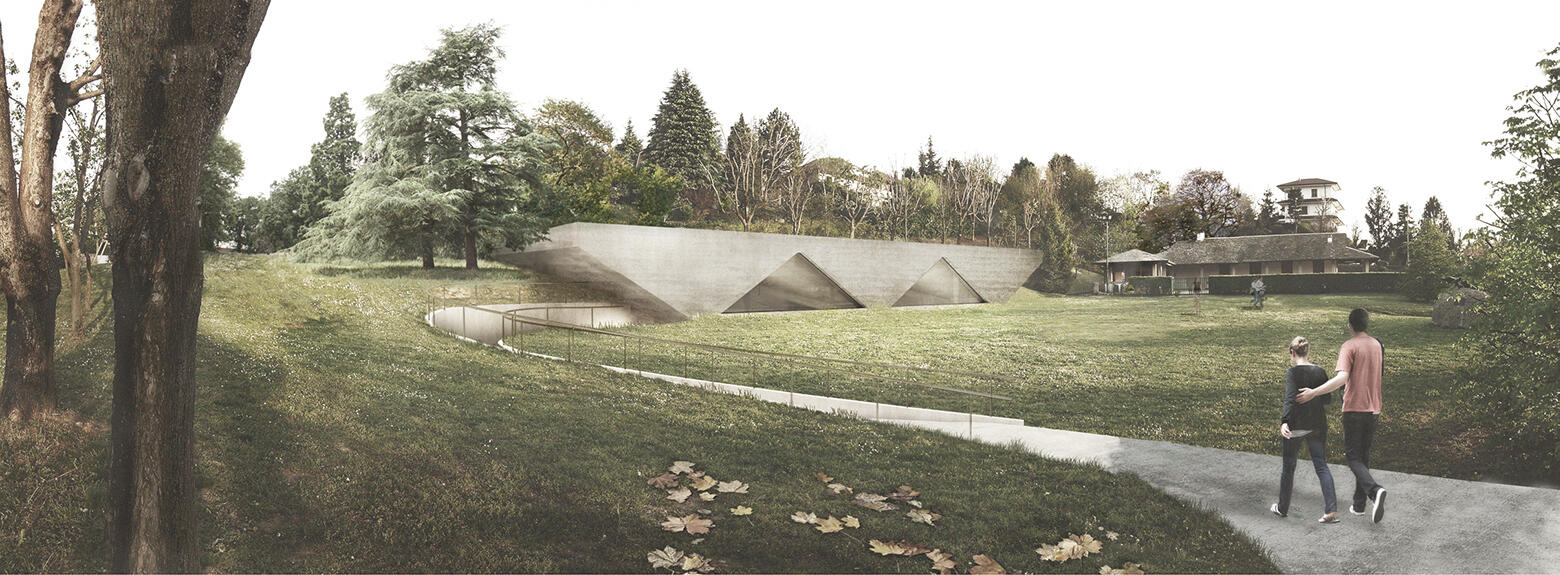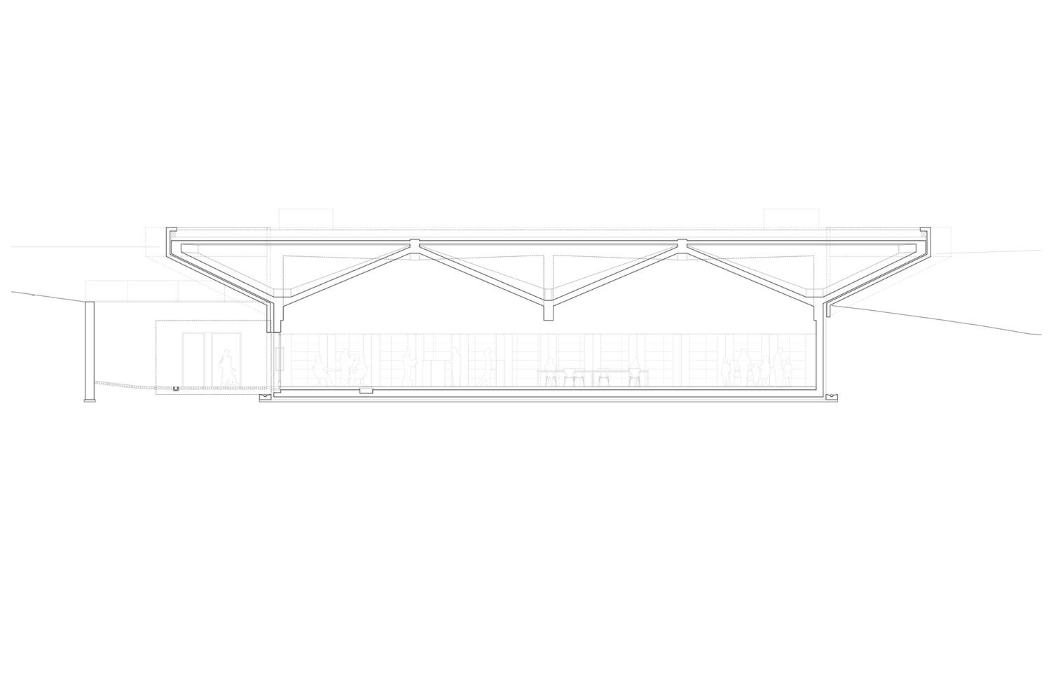 the building is inserted in the slope of the ground and it is characterized and identifiable by a single prospect. a sloping path leads to the entrance, preparing the users for the experience of an unexpectedly buried and bright space. the structural concept is reduced to three tilted pillars placed in support of the wall against the ground. the facade concretizes in a concrete beam-wall made up of five triangles whose vertices seem to be stuck in the ground, in order to define the anchorage of the project to the site. the building is deliberately introverted and does not aspire to establish a direct relationship with the views of the landscape but rather seeks light solutions ideal for the function of the building.