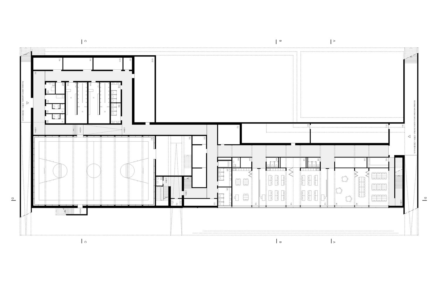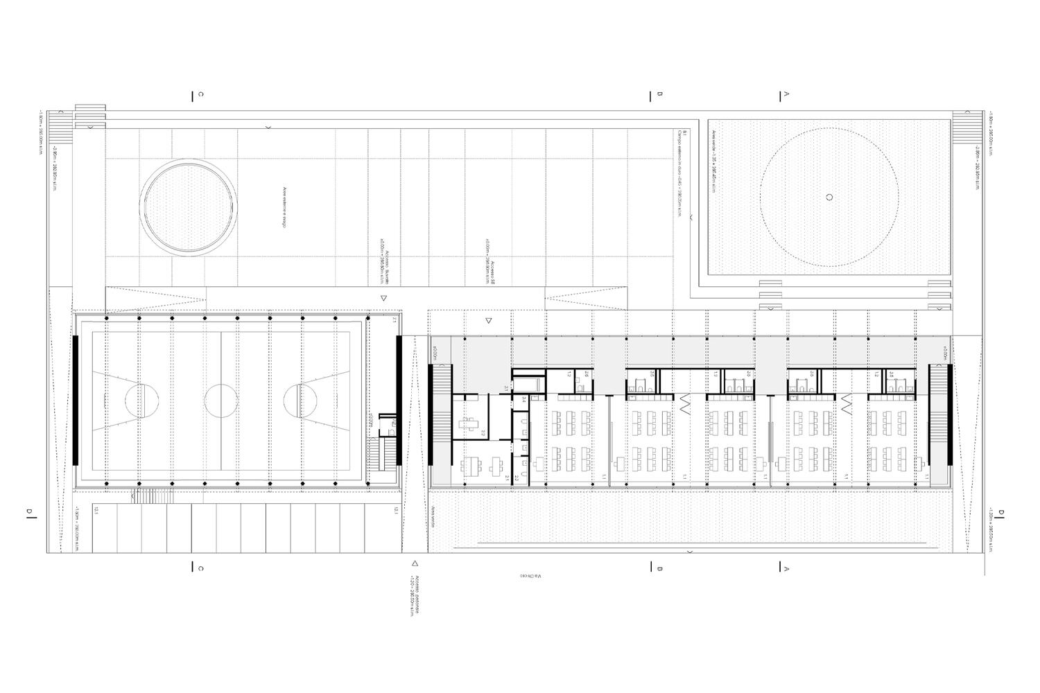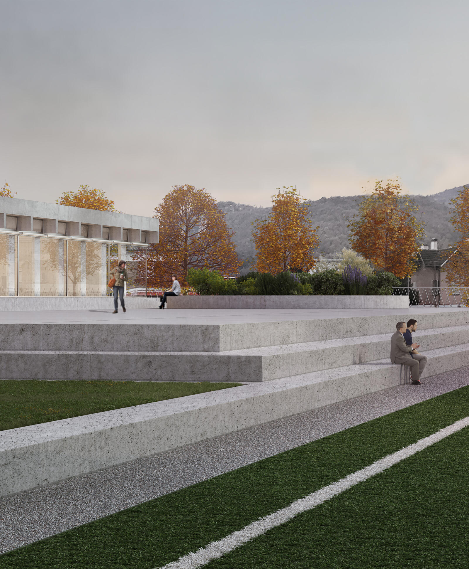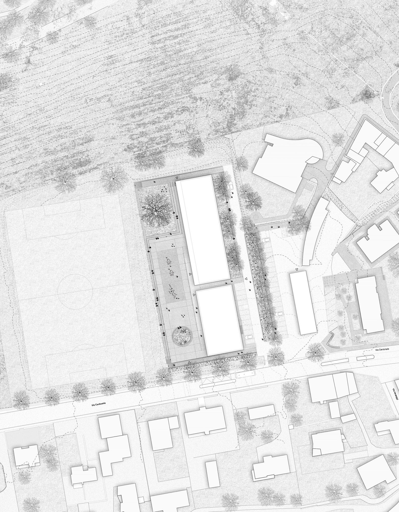 the project is made up of two essential and regular volumes that produce an unicum. they have two different functions: a sport area, and a school. both buildings are developed on two levels, and they are placed on a podium. this element draws an artificial topography with green and paved areas, creating a new relationship with the sport field and the surrounding landscape. the school building is accessed via a covered outdoor area that can be used during the break. then, the volume of the gym emerges from the podium and it is connected to the parking areas by a ramp. since the main entrance is independent, this space can be used also in the evening by sport associations.
