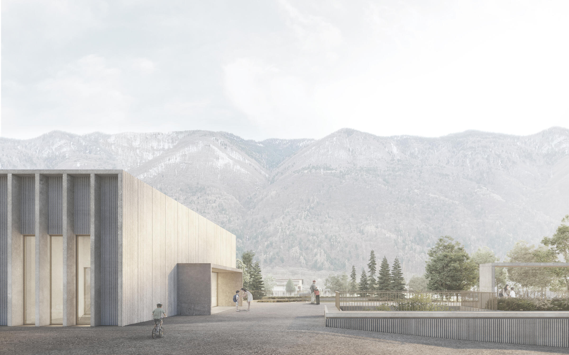 the project maintains a strong relationship with the surrounding context, which is characterized by an existing embankment. the horizontal development of the building strengthens the visual relationship with the landscape behind, connecting the upper level with the green areas.the teaching areas are located along a regular-pitch structure defining a typological principle. the facade is punctuated by a rhythm of “blade” elements whose language recalls buttresses that support the thrust of the mountain terrain that is the main element of this territory.