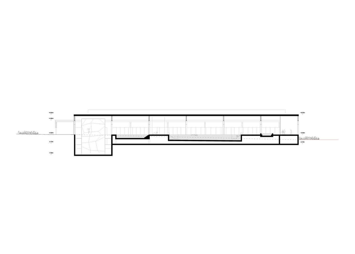 one of the focus was to insert the project in the core of the preexistences and preserving the current park. the project conceals the technical spaces for the pools and the locker rooms in a concrete platform. there is a glazed hall which contains pools and public areas. the steel structure allows wide cantilivers oto overlook the landscape and to reflect the two different existing levels.